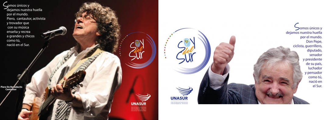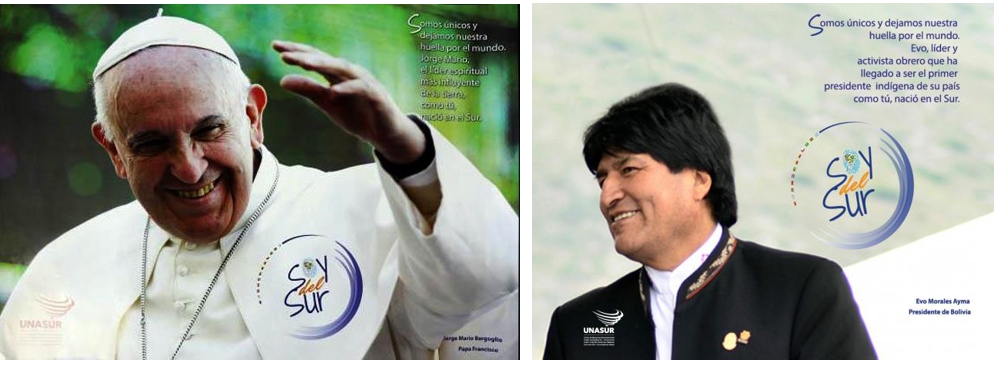 Siete personajes de Suramérica, entre ellos el papa Francisco, el expresidente brasileño Luiz Inácio Lula da Silva y el presidente de Bolivia, Evo Morales, protagonizan la campaña “Soy del Sur”, lanzada para crear la conciencia de identidad suramericana entre los ciudadanos del continente. Impulsada por la Unasur, la campaña contó también con la participación de la presidenta de Chile, Michelle Bachelet, el expresidente de Uruguay José Mujica, el chef peruano Gastón Acurio y el cantante argentino Piero.