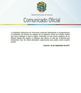 En ese sentido, Arreaza recalcó que Venezuela es un país de paz y que ningún país puede ni tiene derecho a violentar nuestra soberanía. «No aceptamos amenazas del presidente Trump, somos un pueblo de paz y lo que queremos son relaciones de respeto mutuo, no sólo con Estados Unidos, con todos los países del mundo».