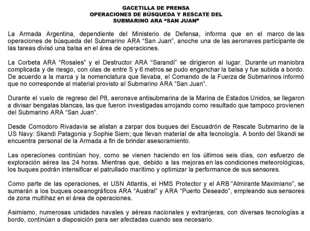 Sobre los ruidos de detectados, Balbi dijo que se está «barriendo» un área de 20 kilómetros por 20 kilómetros para «no de dejar librado nada al azar» y anunció que se recorre con al menos cinco embarcaciones la zona de pérdida y el trayecto que debía realizar el submarino desde Ushuaia a Mar de Plata. «El Presidente nos dijo que utilicemos todos los medios posibles para encontrar al ARA San Juan», reveló el portavoz.