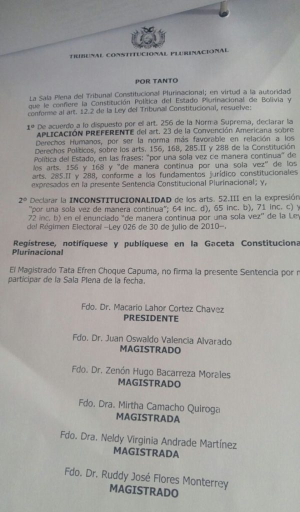 Por unanimidad, el Tribunal Constitucional Plurinacional (TCP) declaró procedente la acción de inconstitucionalidad abstracta presentada por el Movimiento Al Socialismo (MAS) y dio vía libre para que el presidente Evo Morales y otras autoridades departamentales y municipales puedan optar por la reelección indefinida.