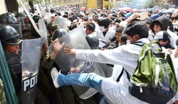 Ayer en La Paz, estudiantes de Medicina de las universidades públicas Mayor de San Andrés (UMSA) y de la UPEA de El Alto, apoyados por otras privadas, se enfrentaron a la Policía en la puertas del Ministerio de Salud y posteriormente en el edificio de la UMSA.