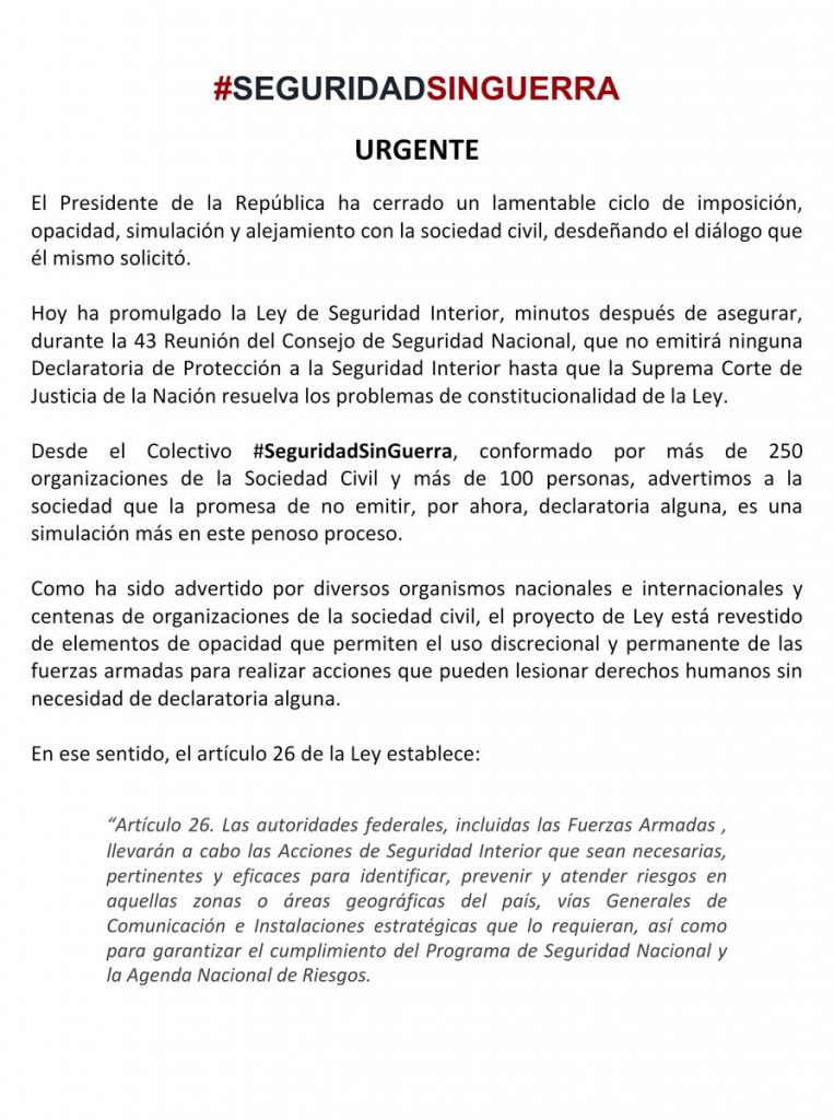 “Es lamentable que el Presidente haya decidido promulgar la Ley de Seguridad Interior a pesar de las múltiples evidencias en su contra y negándose a escuchar a organismos internacionales de derechos humanos que han advertido de las graves consecuencias de la presencia de las fuerzas armadas en las calles.