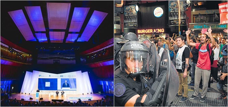 En el lugar estuvieron también la integrante de Madres de Plaza de Mayo Línea Fundadora Nora Cortiñas y el premio Nobel de la Paz Adolfo Pérez Esquivel. “Nosotros nos oponemos a este Tratado (de Libre Comercio) y a la realización del encuentro, que se ha realizado en el marco de deportaciones y restricciones para activistas de distintas partes del mundo”, explicó Patricio del Corro, del FIT.