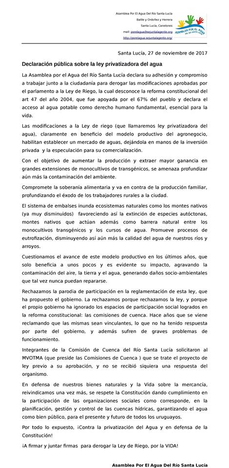 En una declaración el espacio plantea que es “favorable a la participación de la sociedad en las decisiones” y que este referéndum contra la ley de riego es “un proceso más democrático de decisión”. “Asimismo esta ley tiene la particularidad de tener relación con el plebiscito del agua, que contó con el respaldo de una amplia mayoría de la población en 2004, cuando se aprobó que el agua es un derecho humano y un bien público”.
