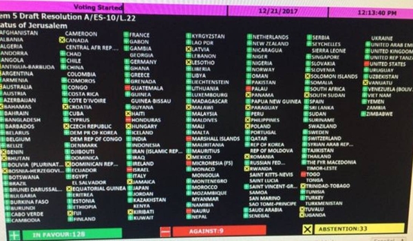 Este 21 de diciembre, la Asamblea General adoptó por abrumadora mayoría de 128 votos a favor y 9 votos en contra una resolución sobre la necesidad de asbtenerse de reconocer a Jersualén como capital de Israel (véase el texto completo de la resolución reproducido al final de esta nota en inglés y en francés). Se trata de un texto que, sin mencionar expresamente a Estados Unidos, responde a la decisión unilateral de reconocer a Jerusalén como capital anunciada el pasado 6 de diciembre por el Presidente de Estados Unidos.