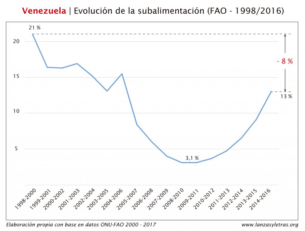 Siempre con base en estadísticas de FAO, al abrir el período analizado vemos que la situación que padece Venezuela aún dista considerablemente de la crisis en la que estaba sumido el país antes del arribo de Hugo Chávez al poder. Si el 13% de población con problemas alimentarios de la actualidad es un dato preocupante, qué decir del 21% que se registró en el trienio 1998-2000: así estaba el país durante la IV República que antecedió a la Revolución chavista.