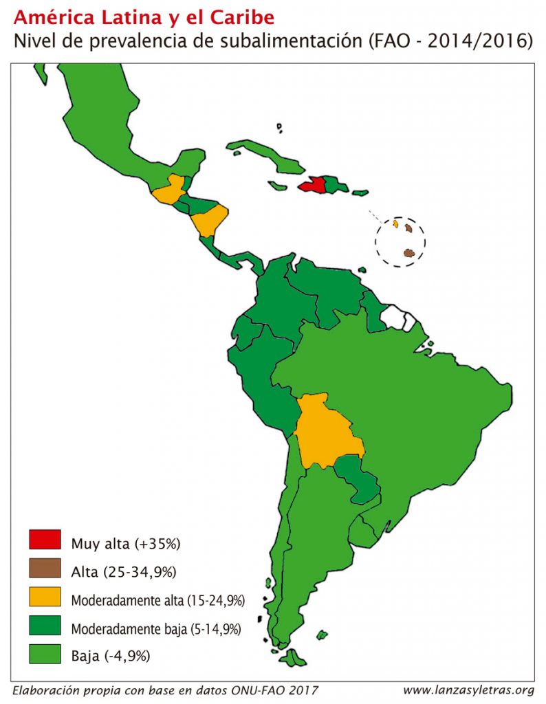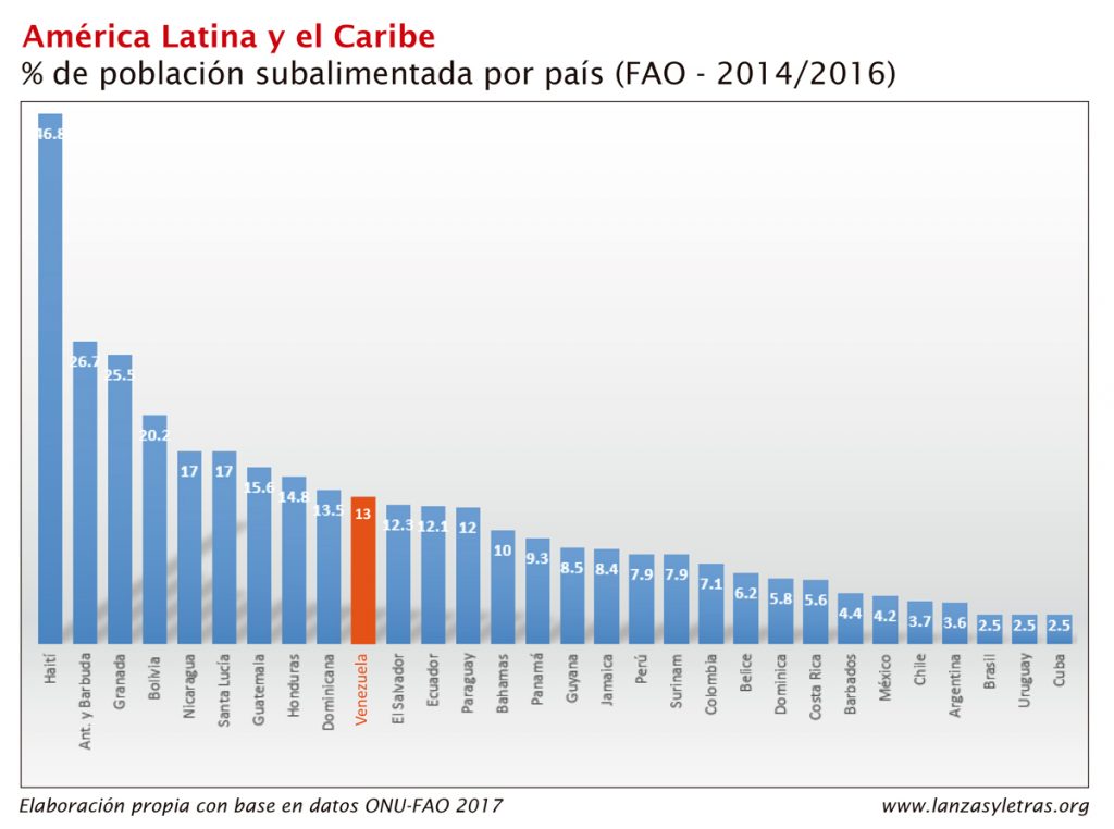 Honduras, Guatemala, Haití, Granada, Nicaragua, República Dominicana, Antigua y Barbuda, Santa Lucía y Bolivia son los 9 estados de América Latina y el Caribe que muestran estadísticas de malnutrición más graves que Venezuela. (En el caso de Bolivia, si bien el índice que señala la FAO es relativamente alto -20%-, los gobiernos de Evo Morales acumulan una disminución de 8% y la medición continúa en baja).