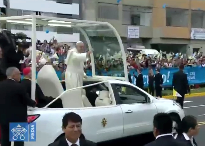 Tras esta breve ceremonia, el primer papa latino recorrió la avenida Faucett hasta la imagen del Inmaculado Corazón de María, en el cruce de las avenidas Brasil y Del Ejército, en el distrito de Jesús María, resguardado por la Guardia Suiza y la Gendarmería del Vaticano, así como de nada menos que mil agentes de la Policía Nacional.