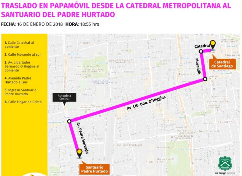 Las calles a utilizará serán Catedral al poniente, Morandé al sur, Alameda al poniente y Padre Hurtado al sur (por la caletera oriente de General Velásquez) hasta el ingreso al santuario.