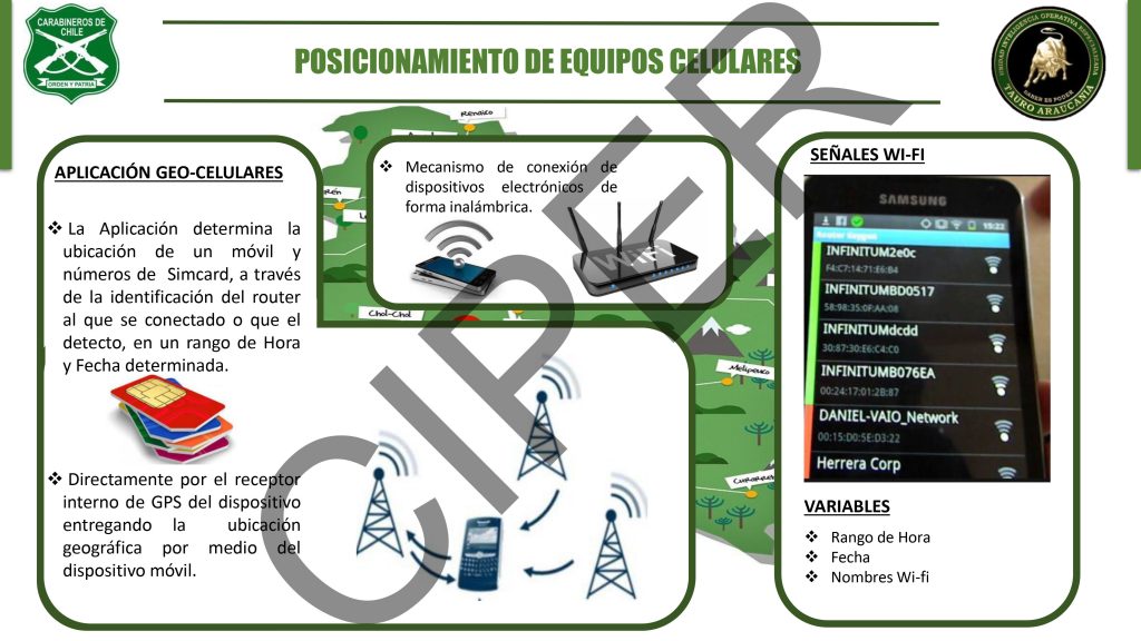 “Otra de las aplicaciones que desarrollé fue una para determinar la ubicación de los teléfonos en determinados lugares. Esta herramienta la desarrollé para una investigación a cargo de la Fiscalía de San José de la Mariquina. Este software existe en el mercado y fue ofrecido a Carabineros por la misma empresa que vendió el equipo “Oxygen foresnse” y a través de él es posible, ingresando el número telefónico, determinar en qué lugar se encuentra un determinado teléfono celular, sin embargo, esta herramienta no permite determinar donde estuvo el teléfono con anterioridad. El valor de este software, según entiendo, es de cerca de $200 millones, y la empresa que lo desarrolló es norteamericana. Como el valor es muy elevado comencé a desarrollar esta herramienta, pero aún no concluyo el trabajo, a pesar de que he realizado pruebas de campo”.