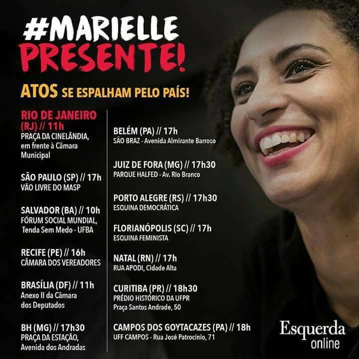 En las redes sociales, se multiplicaban durante la madrugada los llamados para organizar manifestaciones frente a la Asamblea Legislativa de Rio (Alerj) y en otros puntos de la ciudad para repudiar el crimen. «¡Marcha contra el genocidio negro! SOMOS Marielle Franco», decía una de esas convocatorias, que en pocas horas había recogido unas 20.000 promesas de asistencia. También por la noche del jueves se organizaban otras protestas en Sao Paulo y Belo Horizonte.