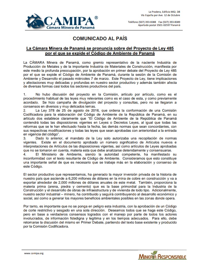 La Cámara Minera de Panamá reaccionó mediante un comunicado al conflicto que mantiene paralizadas las operaciones en el proyecto Minera Panamá, ubicado en Donoso, provincia de Colón y lo tildó como un problema de orden público por lo que exige al Gobierno garantizar la seguridad de una mayoría de trabajadores.
