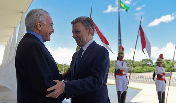 Los presidentes de Colombia y Brasil, Juan Manuel Santos y Michel Temer, expresaron el interés de sus gobiernos de trabajar unidos para fortalecer el comercio binacional, así como fortalecer la seguridad ciudadana, con especial énfasis en las fronteras.