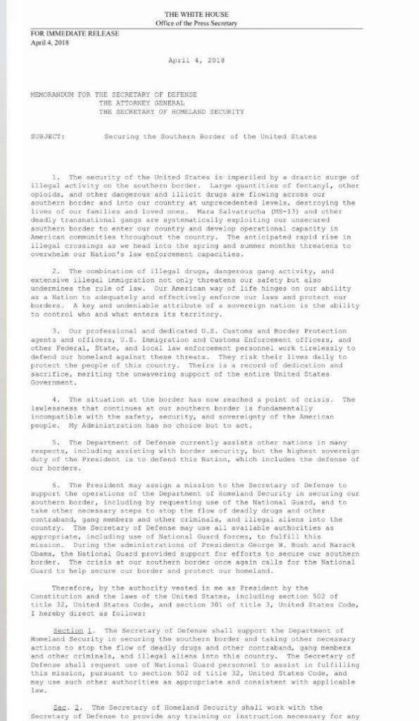 Y finalmente por la noche, Donald Trump envió su decreto con seis puntos, sin aparecer públicamente argumentó que la situación en la frontera sur ha llegado a un punto de crisis por la combinación del narcotráfico, pandillas y la inmigración ilegal.