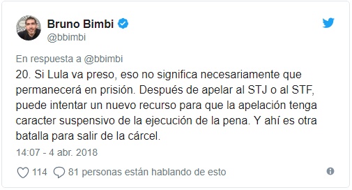 Condenado en enero por el Tribunal Regional Federal 4, de segunda instancia, el líder del PT demandó un hábeas corpus para permanecer en libertad, y continuar en campaña, hasta que se agoten todas las instancias de apelación. Estas instancias incluyen al Tribunal Superior de Justicia, que es la tercera y al Supremo Tribunal Federal, el cuarto y último paso.