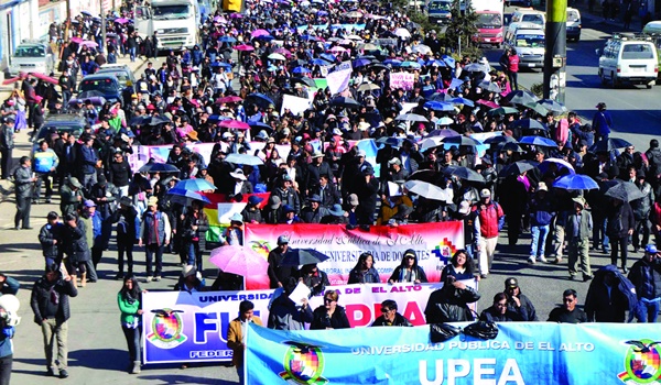En la sede de Gobierno, desde muy temprano la manifestación convocada por la Universidad Pública de El Alto (UPEA) recorrió la avenida Juan Pablo II y descendió hasta el centro paceño, para luego reunirse en inmediaciones de la avenida Montes, con los manifestantes de la Universidad Mayor de San Andrés.