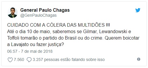 “CUIDADO COM A CÓLERA DAS MULTIDÕES! Até o dia 10 de maio, saberemos se Gilmar, Lewandowski e Toffoli tomarão o partido do Brasil ou do crime. Querem boicotar a Lavajato ou fazer justiça?”, escreveu na noite de segunda-feira (7).