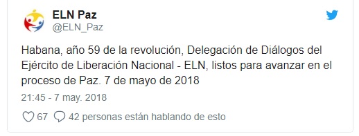 A través de la cuenta @ELN_Paz la delegación de negociadores del ELN anunció que se encuentran en La Habana para avanzar en el proceso de Paz.