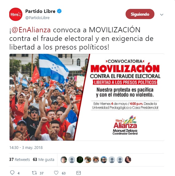 El coordinador general del Partido Libertad y Refundación (Libre) y expresidente de Honduras, Manuel Zelaya, llamó a la población hondureña a marchar pacíficamente para exigir la renuncia del presidente de Honduras Juan Orlando Hernández, tras lo que denuncian como un fraude electoral.