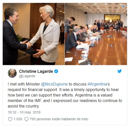El ministro Dujovne y yo nos reunimos hoy (por este miércoles) para analizar cómo el FMI puede ayudar a las autoridades en el fortalecimiento de la economía argentina a la luz de la renovada y significativa volatilidad de los mercados financieros. Nuestra reunión fue una oportunidad propicia para que el ministro Dujovne reafirmara las prioridades y planes económicos del gobierno, y para que yo escuchara cómo podemos en el FMI apoyar mejor los importantes esfuerzos del gobierno.