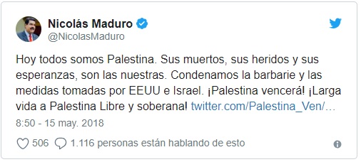 “Venezuela manifiesta su enérgico rechazo ante las acciones violentas contra el Pueblo palestino, como reacción israelí a la multitudinaria marcha en Gaza en protesta por la transferencia arbitraria de la embajada estadounidense ante Israel, a la ciudad de Jerusalén”, así escribió en la red social de Twitter el Canciller de la República de Venezuela, Jorge Arreaza.