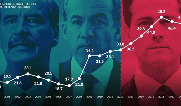 En el periodo de Vicente Fox Quesada (2000-2006), cuando Francisco Gil Díaz fue el Secretario de Hacienda, se elevó un 44.41 por ciento, y durante la presidencia de Calderón, los titulares Agustín Carstens Carstens, Ernesto Cordero Arroyo y José Antonio Meade, quienes enfrentaron una recesión, aumentó 159.58 por ciento. Respecto a la cifra, pasó de 28.8 por ciento del PIB en 2007 a 37.2 por ciento del PIB.