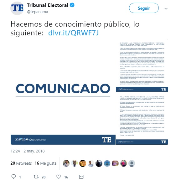 Luego de tres días de que el presidente de la República, Juan Carlos Varela, desafiara la veda electoral en un acto oficial en Cutevilla, población de La Pintada, provincia de Coclé, el Tribunal Electoral se pronunció este martes, 1 de mayo.