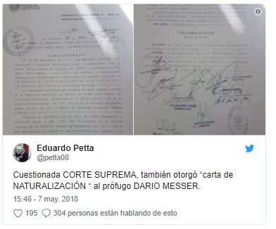 El senador Eduardo Petta San Martín se mantiene firme en su postura y publicó la resolución de la Corte para mostrar que Alicia Pucheta de Correa fue una de las magistradas que otorgó la nacionalidad paraguaya a Darío Messer, el «cambista de los cambistas» procesado en Brasil y prófugo de la justicia internacional por liderar una de las redes más grandes de lavado de dinero en los últimos años.