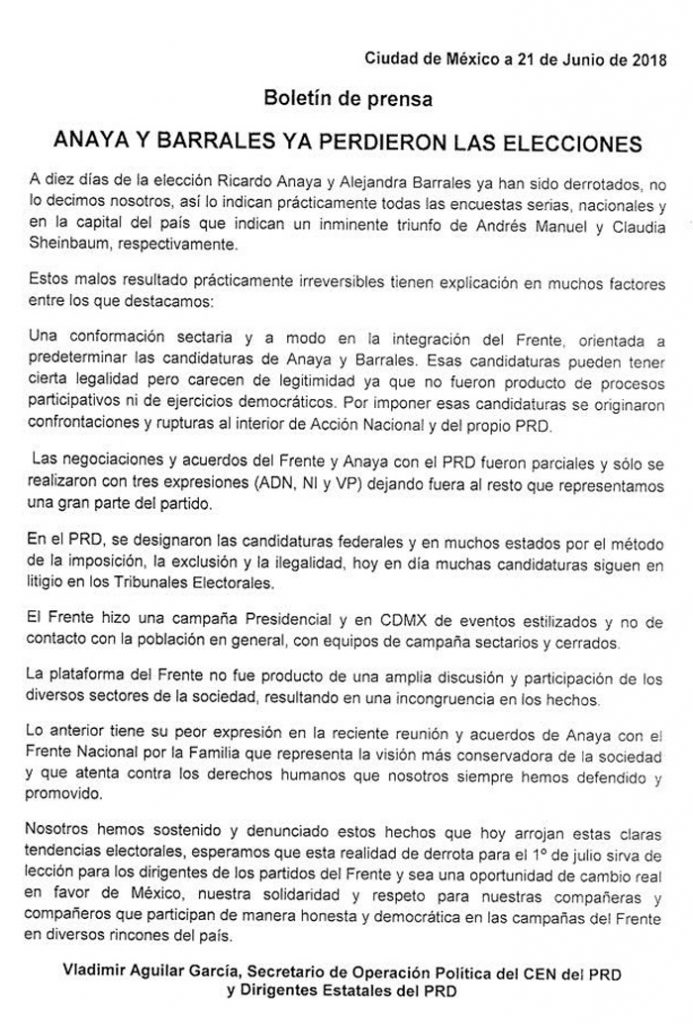 El 21 de junio pasado, dirigentes estatales y el secretario de Operación Política del Comité Ejecutivo Nacional del PRD, Vladimir Aguilar García, reconocieron por medio de una misiva que el candidato presidencial Ricardo Anaya Cortés, así como la aspirante a la Jefatura de Gobierno de la Ciudad de México, Alejandra Barrales Magdaleno, “ya han sido derrotados”.