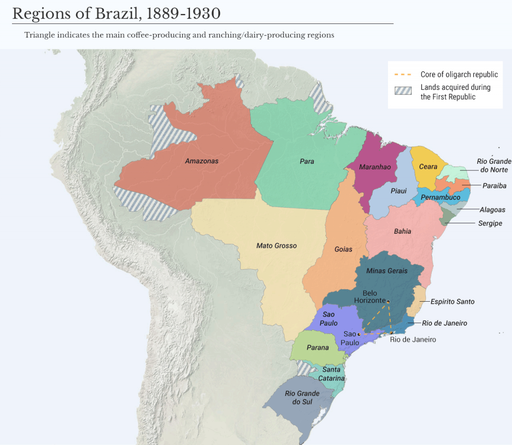 La Primera República tenía un sistema federal fuerte y se regía por un acuerdo de poder compartido entre los tres estados más ricos de Brasil: Minas Gerais, Sao Paulo y Río de Janeiro. El acuerdo se conoció como la política del “café con leche” porque dividió el poder entre las tres regiones dominadas por el café y las industrias lácteas. Durante este tiempo, la agricultura se volvió crítica no solo para la economía de Brasil sino también para su política: los oligarcas que hicieron su riqueza a través de la agricultura tuvieron mucha influencia sobre la política regional, y algunos académicos e historiadores incluso se han referido al gobierno de 1889-1930 en Brasil como una república oligarca.