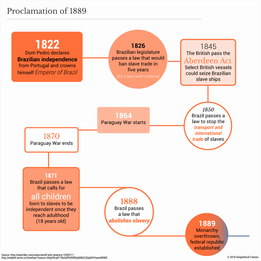 Pero esta relación tuvo un costo para Brasil. El Reino Unido abolió la esclavitud en las Indias Occidentales en 1833, y poco después, comenzó a utilizar sus lazos armados y económicos con Brasil para presionar al país a hacer lo mismo. Desde 1850 hasta 1888, la monarquía en Brasil aprobó leyes que conducirían a la eliminación gradual de la esclavitud en el país. Las élites empresariales fueron las más afectadas por estos cambios legales porque los mayores costos laborales amenazaban con recortar sus ganancias de los productos agrícolas.