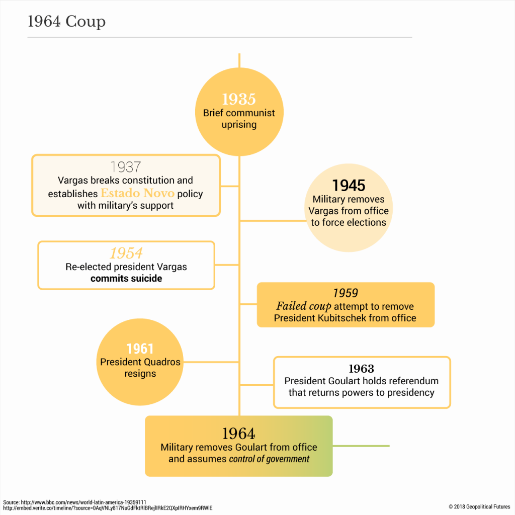 Este Deep Dive examinará tres casos importantes de intervención militar en Brasil: la Proclamación de 1889, la revolución de 1930 y el golpe de 1964. Comparar estos ejemplos con lo que está sucediendo hoy en Brasil ayudará a determinar la probabilidad de que los militares intervendrán para ayudar al país a enfrentar los desafíos sustanciales que enfrenta ahora.