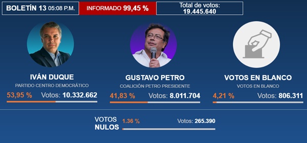 A las 4:49 de la tarde y escrutados el 96,99% de las mesas de votación del país, Duque obtiene un total de 10’077.906 votos por 7’776.917 sufragios de Gustavo Petro. El voto en blanco obtiene un total de 4,2% con 783.020 votos.