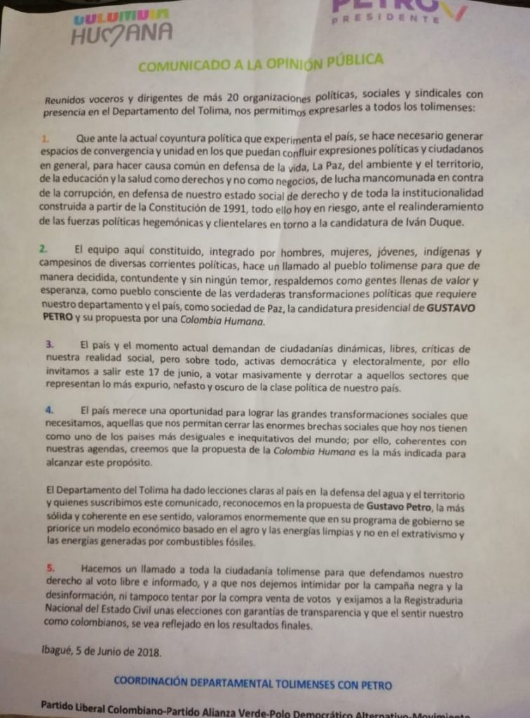 Por medio de una rueda de prensa los lideres e integrantes de los partidos políticos como el ASI, Alianza Verde, Unión Patriótica y Liberal del departamento del Tolima, tomaron la decisión de apoyar en segunda vuelta al candidato presidencial de la Colombia Humana, Gustavo Petro.