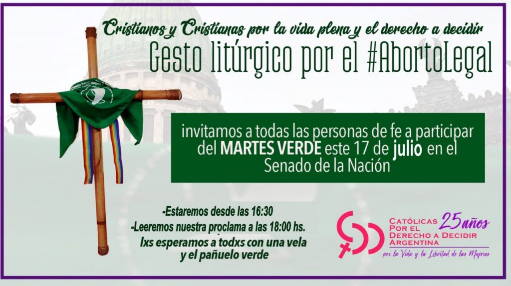 Las agrupaciones religiosas reunidas bajo el nombre de Cristianas y Cristianos por la vida plena y el derecho a decidir realizarán hoy martes a las 18 en la esquina de Hipólito Yrigoyen y Entre Ríos, frente al Senado de la Nación, un acto litúrgico en el marco del Martes Verde.