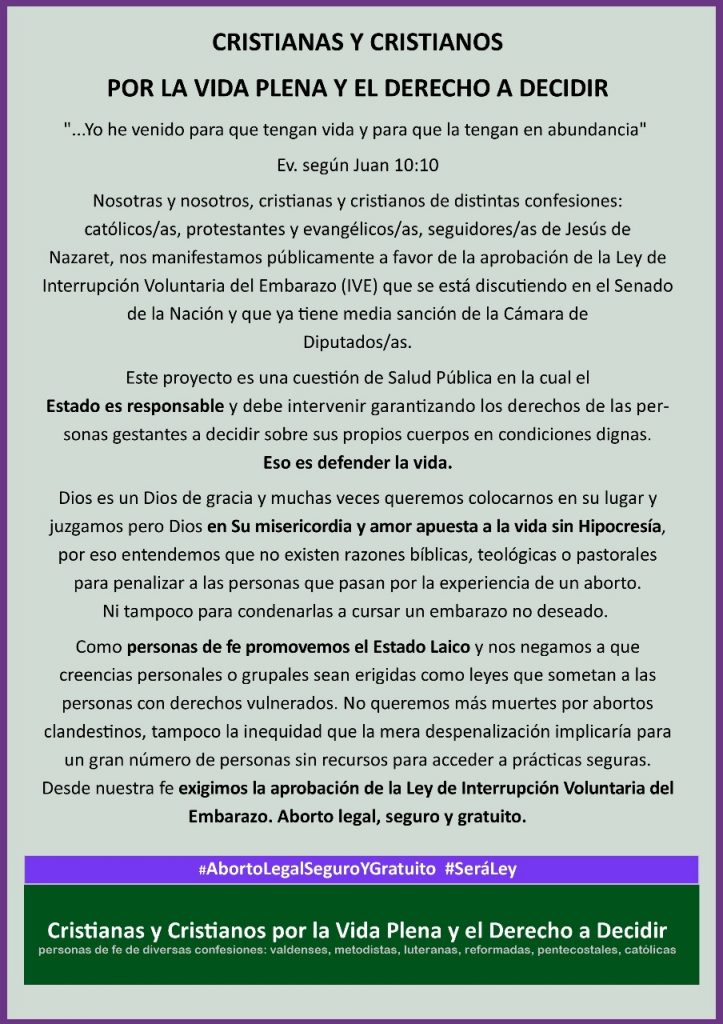 «Como personas de fe promovemos el Estado Laico y nos negamos a que creencias personales o grupales sean erigidas como leyes que sometan a las personas con derechos vulnerados. No queremos más muertes por abortos clandestinos, tampoco la inequidad que la mera despenalización implicaría para un gran número de personas sin recursos para acceder a prácticas seguras. Desde nuestra fe exigimos la aprobación de la Ley de Interrupción Voluntaria del Embarazo. Aborto legal, seguro y gratuito», finalizan.