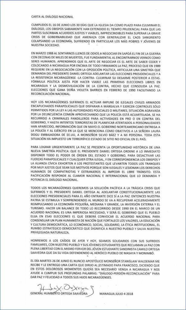 El general en retiro Humberto Ortega, ex jefe del Ejército de Nicaragua y hermano del presidente Daniel Ortega, divulgó una carta este miércoles en la que pide el adelanto de las elecciones, el desarme de los grupos parapoliciales y el desmontaje de los tranques en las carreteras.