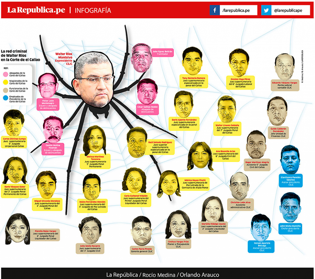 Desde jueces superiores hasta simples empleados fueron parte del esquema de corrupción que se forjó en el sistema judicial del primer puerto. Luego de analizar la transcripción de centenares de horas de conversaciones telefónicas interceptadas entre enero y julio de este año, la fiscal especializada en Crimen Organizado del Callao, Rocío Sánchez Saavedra, identificó a 30 personas que participaron en una suerte de sociedad secreta que actuaba en la jurisdicción de la Corte Superior de Justicia del Callao. Sánchez señala al expresidente Walter Ríos Montalvo como la cabeza de una red que actuaba bajo sus órdenes.