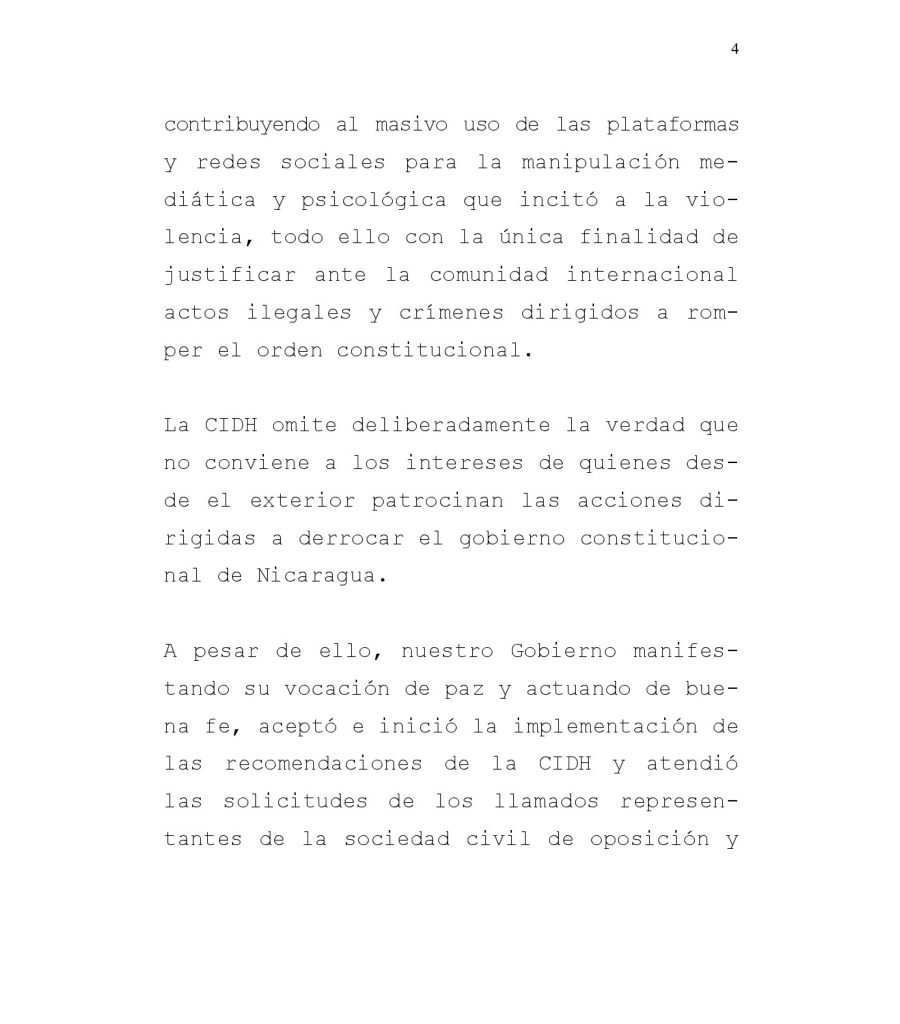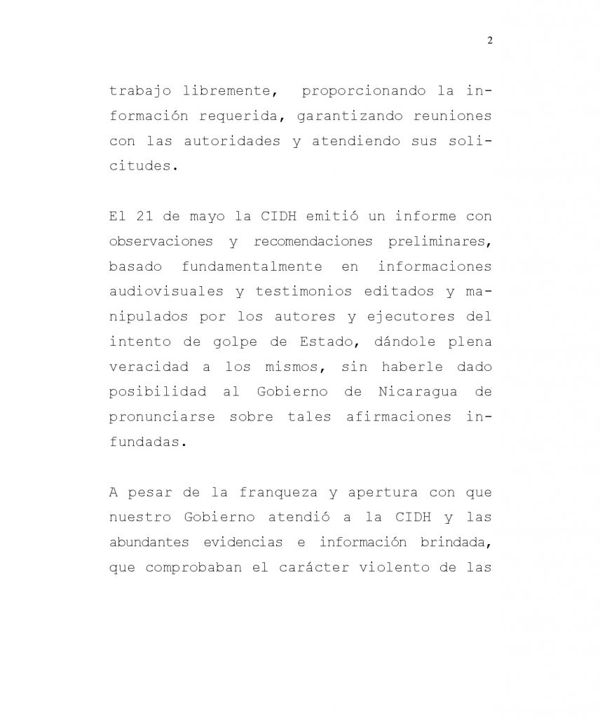 El Ejecutivo nicaragüense afirmó que el informe de la CIDH está basado “en informaciones audiovisuales y testimonios editados y manipulados por los autores y ejecutores del intento de golpe de Estado, dándole plena veracidad a los mismos, sin haberle dado posibilidad al Gobierno de Nicaragua de pronunciarse sobre tales afirmaciones infundadas”.
