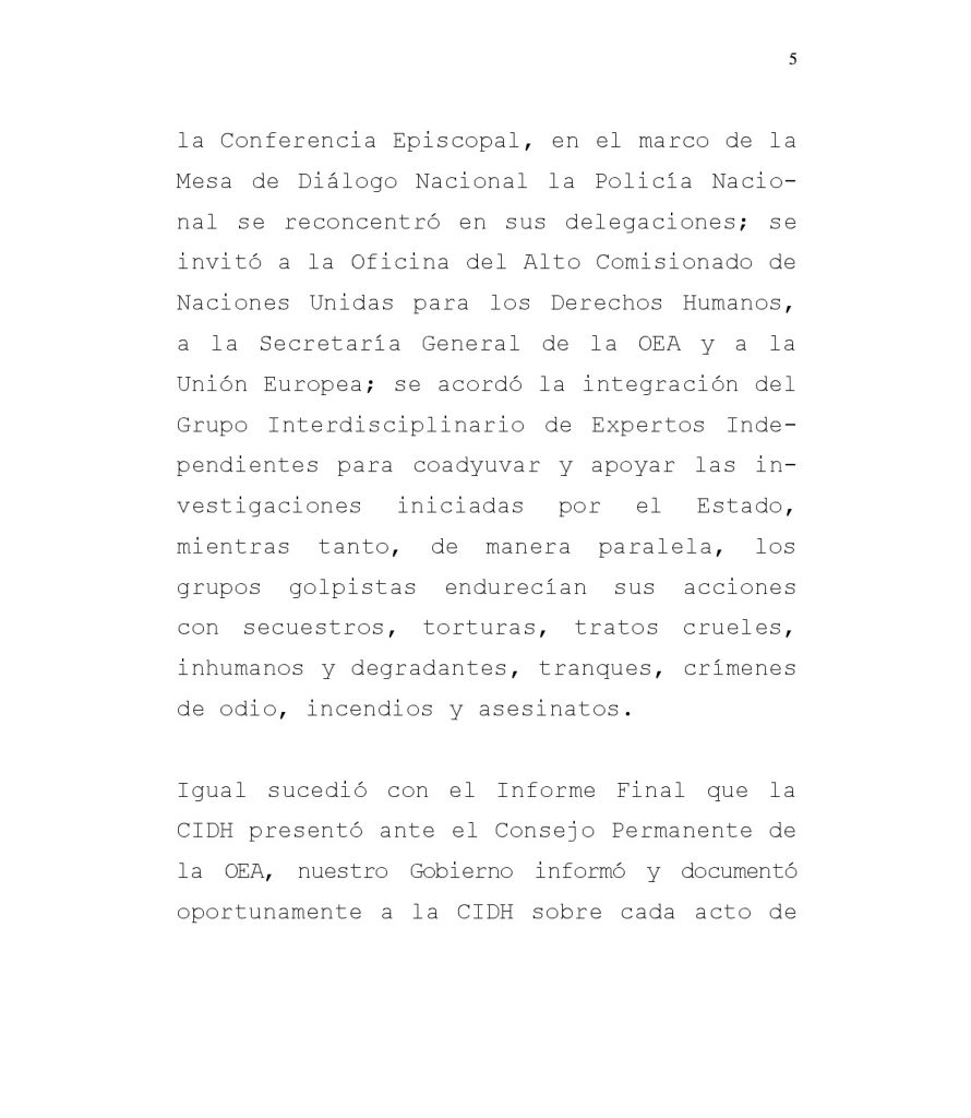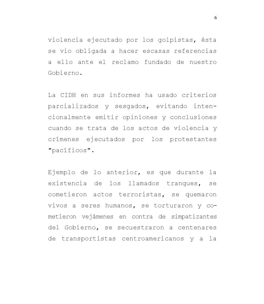 “La CIDH manipuló la información, convirtiendo un intento de golpe de Estado en una supuesta protesta pacífica, omitiendo deliberadamente que las personas asesinadas en su mayoría son policías, funcionarios del Estado, militantes sandinistas y civiles ajenos al conflicto”, dice el informe del Gobierno.