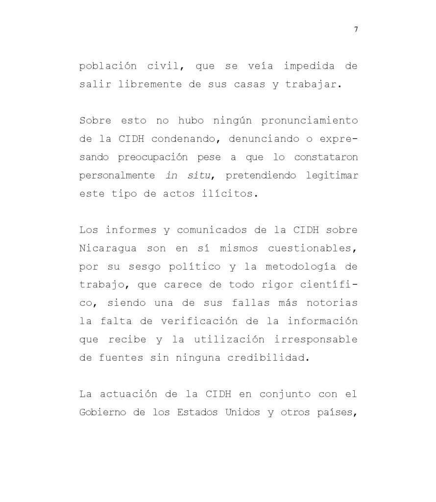 “Los informes y comunicados de la CIDH sobre Nicaragua son en sí mismos cuestionables, por su sesgo político y la metodología de trabajo, que carece de todo rigor científico, siendo una de sus fallas más notorias la falta de verificación de la información que recibe y la utilización irresponsable de fuentes sin ninguna credibilidad”, insiste el Gobierno.