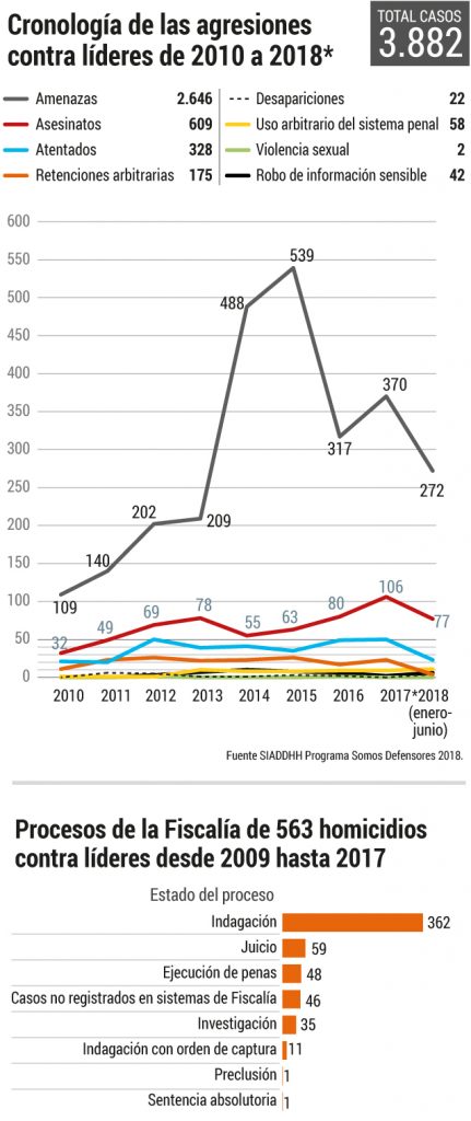 Tras la firma del Acuerdo de Paz entre el Gobierno y las Farc, la primera mitad del 2018 era sin duda el tiempo para medir qué tanto reducirían las agresiones contra los líderes sociales. A lo largo de los años del conflicto, fueron mediadores entre los actores armados y sus comunidades y por eso también los estigmatizaron y asesinaron. A principios de este año, las elecciones parlamentarias y presidenciales midieron por primera vez el pulso entre dos fuerzas opuestas (izquierda y derecha), las cuales se enfrentaron en las urnas en el pasado, pero en medio de las balas de un conflicto político en el que murieron cientos de sus líderes.