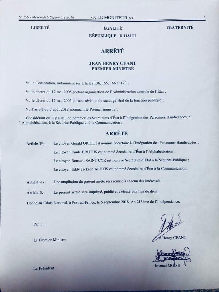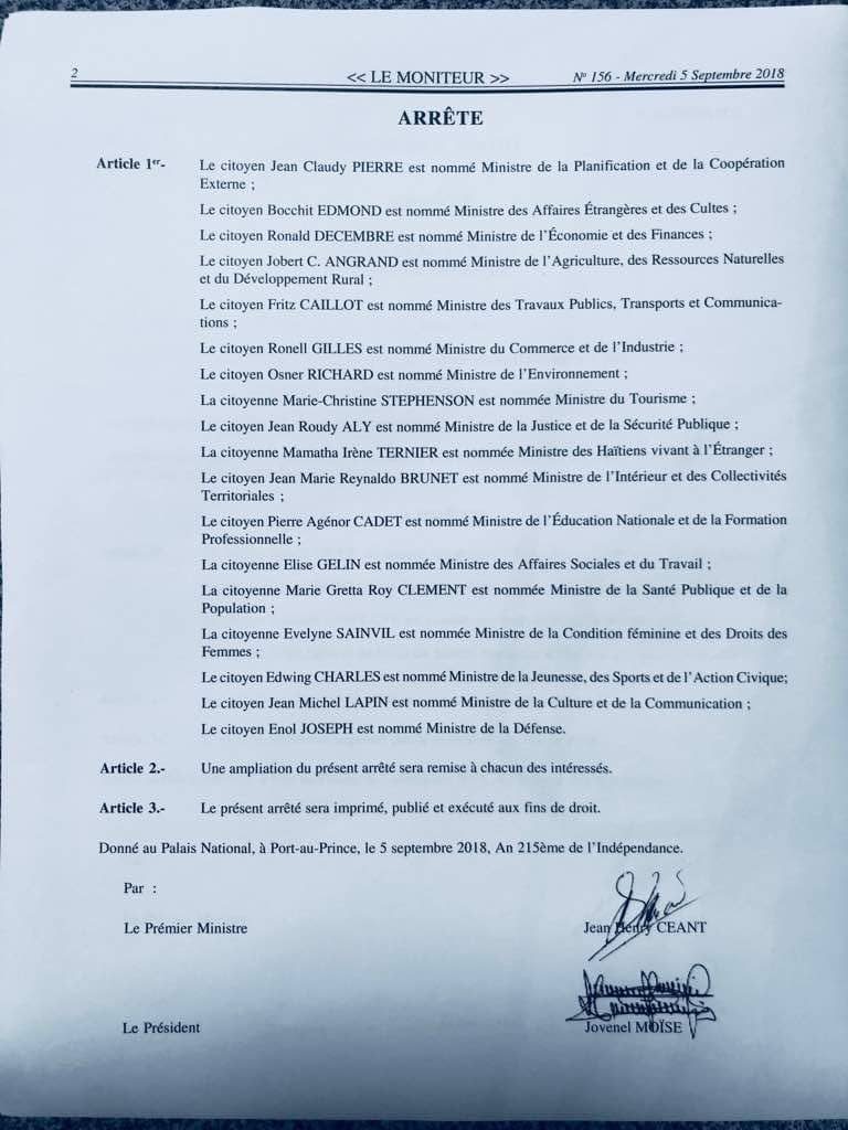 Encabezado por el primer ministro designado Jean Henry Céant, permanecen frente a su cartera los titulares de Educación, Obras Públicas y Comunicaciones, Interior y Comunidades Territoriales, Salud, Agricultura y Justicia y Seguridad Pública.