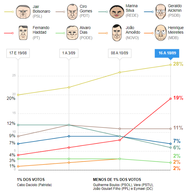 Pesquisa Ibope divulgada nesta terça-feira mostra que o candidato do PT a Presidência Fernando Haddad cresceu 11 pontos percentuais e assumiu a vice-liderança com 19% das intenções de voto. Jair Bolsonaro oscilou dois pontos percentuais em relação a pesquisa anterior e chegou a 28%.