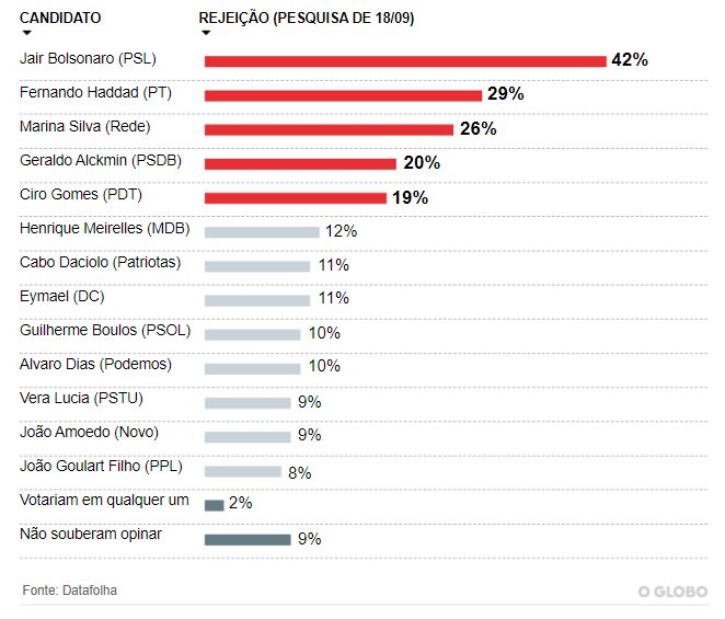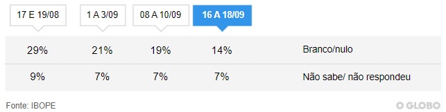 Pesquisa IBOPE realizada entre os dias 16 e 18 de setembro. A margem de erro é de dois pontos percentuais para mais ou menos