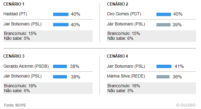 El sondeo de Ibope ratificó asimismo que detrás de Bolsonaro y Haddad se sitúan, a distancia, Ciro Gomes, del Partido Democrático Laborista (PDT, por sus siglas en portugués) con 11 por ciento de intención de voto; el aspirante del Partido de la Social Democracia Brasileña (PSDB) Geraldo Alckmin (7) y Marina Silva, de Red (6).