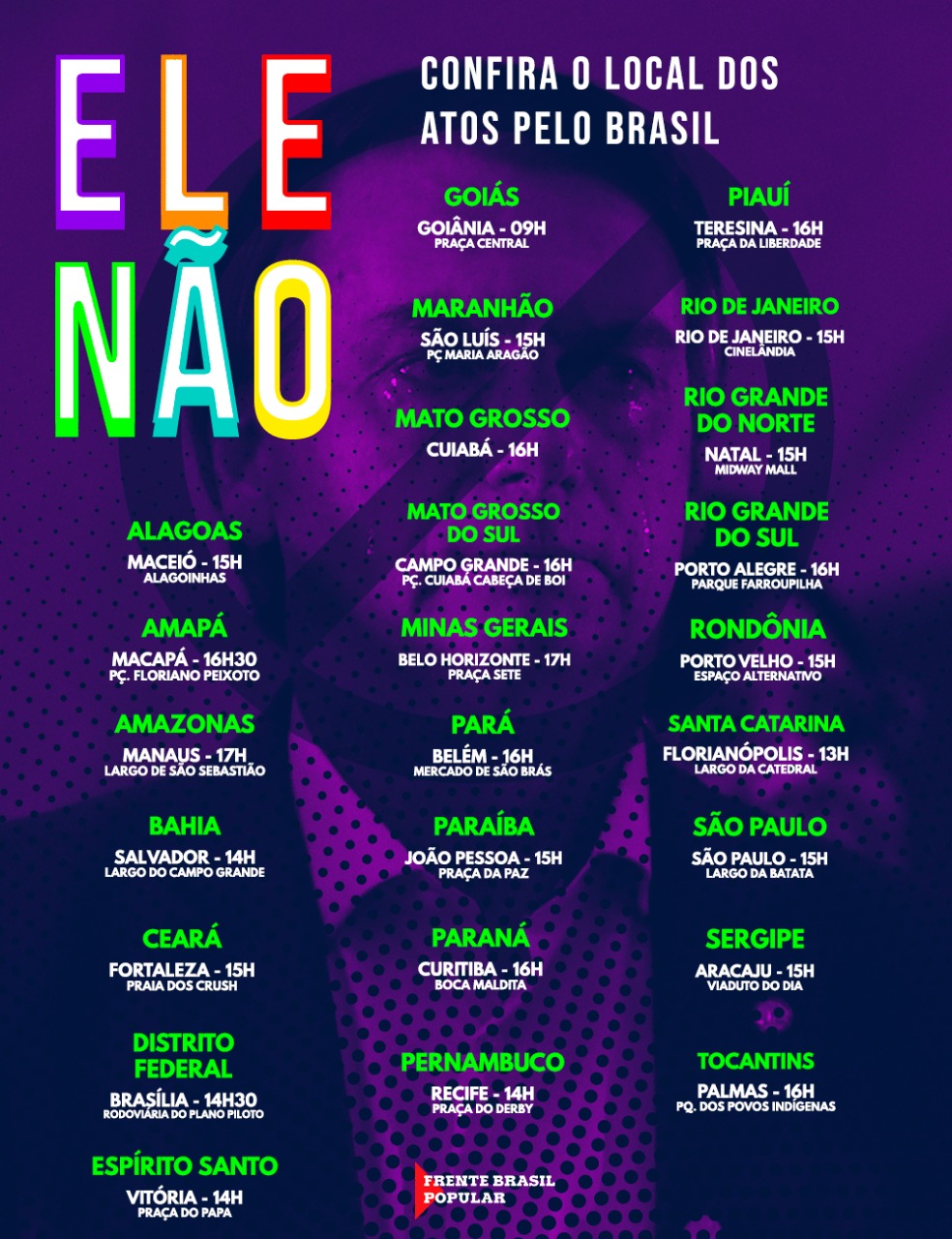 El movimiento surgió de forma bastante espontánea, varios grupos ya estaban articulándose cuando Mulheres de Bahía convocadas por una feminista llamada Ludmila Teixeira resolvieron hacer una reunión, conversar con representantes de distintos grupos y articular en uno solo. Cuando lanzaron el grupo «Mujeres Unidas Contra Bolsonaro» en Facebook fue un efecto cascada, en poco tiempo ya tenía miles de mujeres y pasó a tener millones, y ya somos unas cuatro millones de mujeres que participamos. Desde ahí se convocaron actos y movilizaciones para este sábado 29 en todo Brasil, y son las mujeres las que están al frente y se han ido incorporando otros grupos, como la comunidad LGBT+, grupos cristianos, judíos, hombres, en fin, es un movimiento que tomó una proporción mucho mayor de la que se esperaba y ahora la gente asegura que vamos a tener grandes actos acá y fuera del país también, ya son 24 países los que van a participar de los actos este fin de semana.