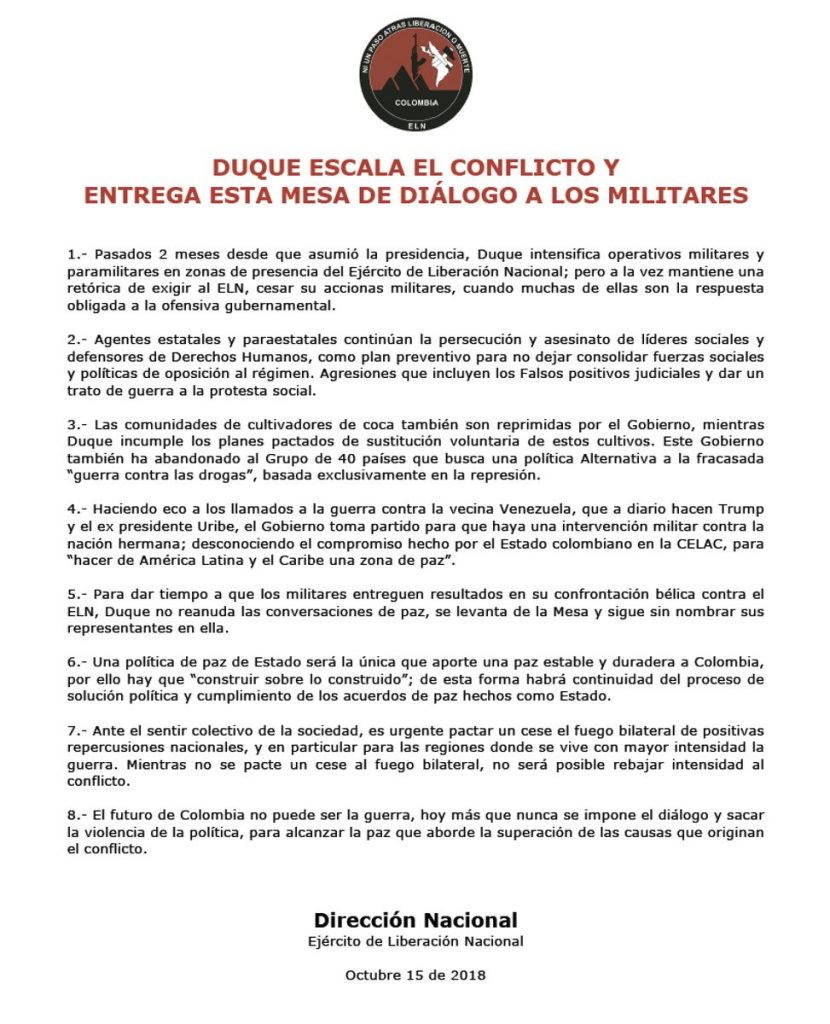 El ELN afirmó en su comunicado publicado este lunes festivo que dos meses después de que Duque asumiera la Presidencia, se intensificaron los operativos militares en su contra.