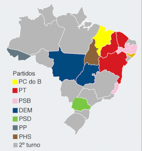 PT e PSB elegeram 3 governadores cada. DEM conquistou 2 governos. MDB, PP, PSD, PHS, PC do B já terminam este 7 de outubro com 1 governo eleito.