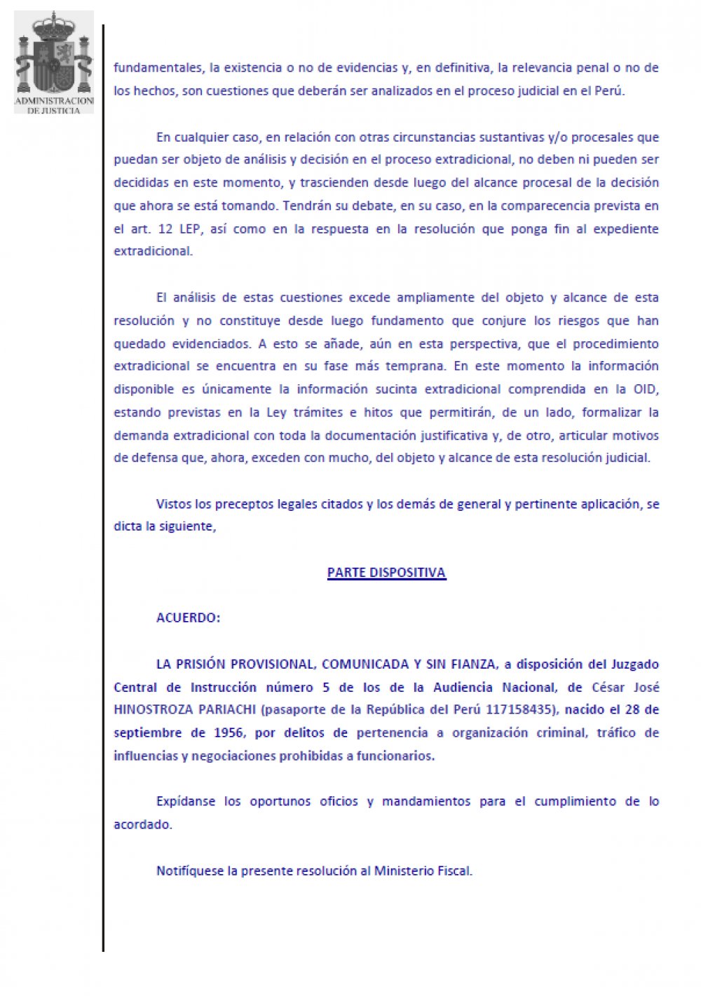 Para justificar la decisión, el juzgado español indicó que, pese a que la información del caso es breve, «es también contundente: los hechos imputados reflejan que la persona reclamada sería el líder de una organización criminal», en alusión a Los Cuellos Blancos del Puerto.